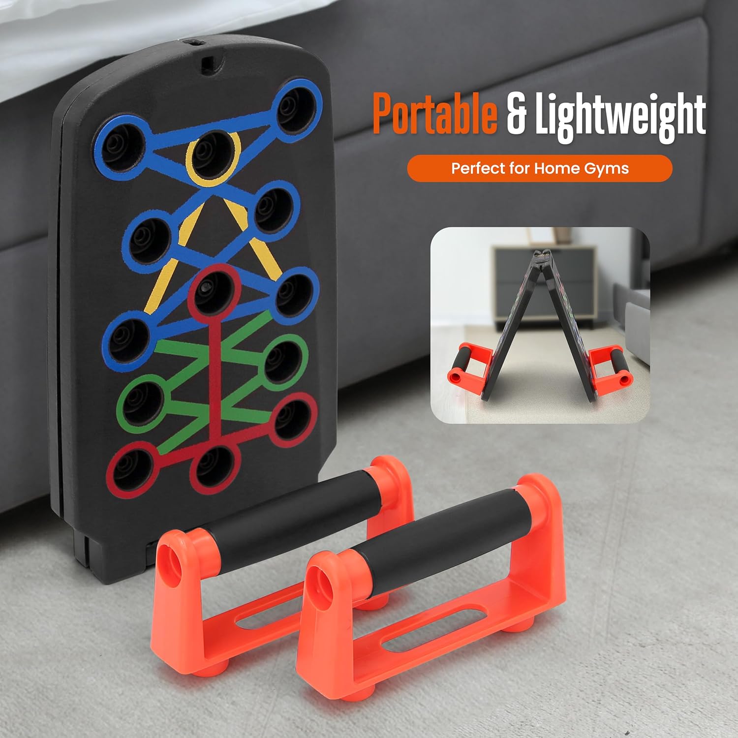 PORTABLE PUSH-UP BOARD EQUIPMENT: Portable pushup board for a variety of exercises. Complete set with exercise bands to provide strength training, resistance workouts, and cardio exercise