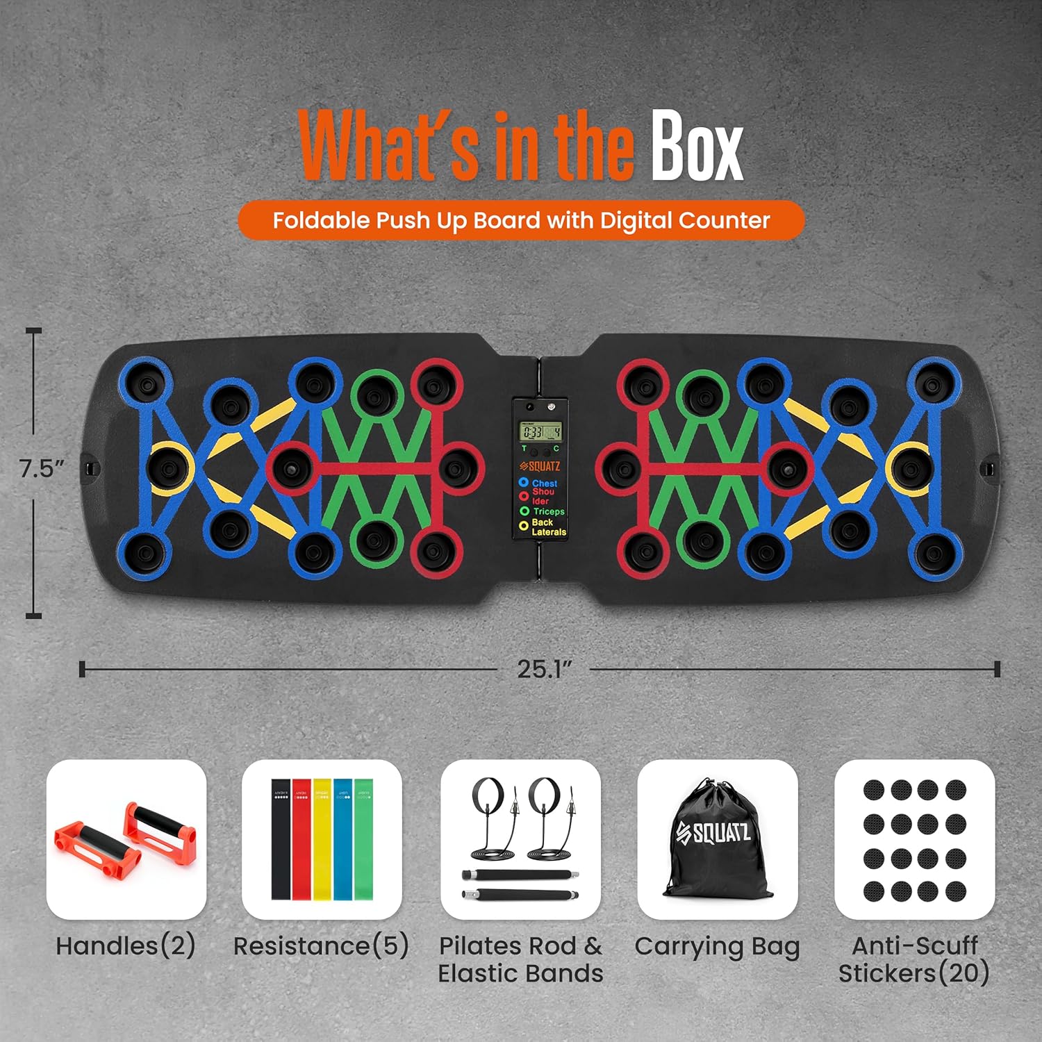 Be the first to review “SQUATZ Portable Push Up Board – Bars Includes 5 Resistance Bands, Bag, and Pilates Rod – Work Out Equipment for Home Gym for Full Body – Strength Training Equipment Handles – Capacity 661 LBS”