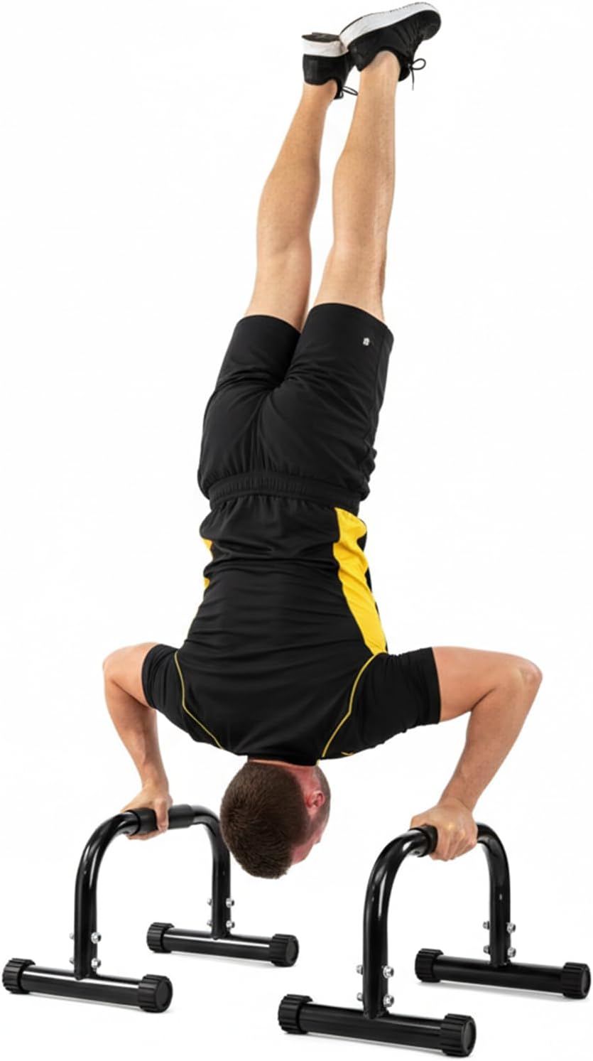 The push up bars are made of high-strength steel with a weight-bearing capacity that supports advanced calisthenics movements, feature anti-slip bases and foam grip points to ensure stability during handstand practice, L-sit, and planche training, won’t wobbly or move once your weight on them
