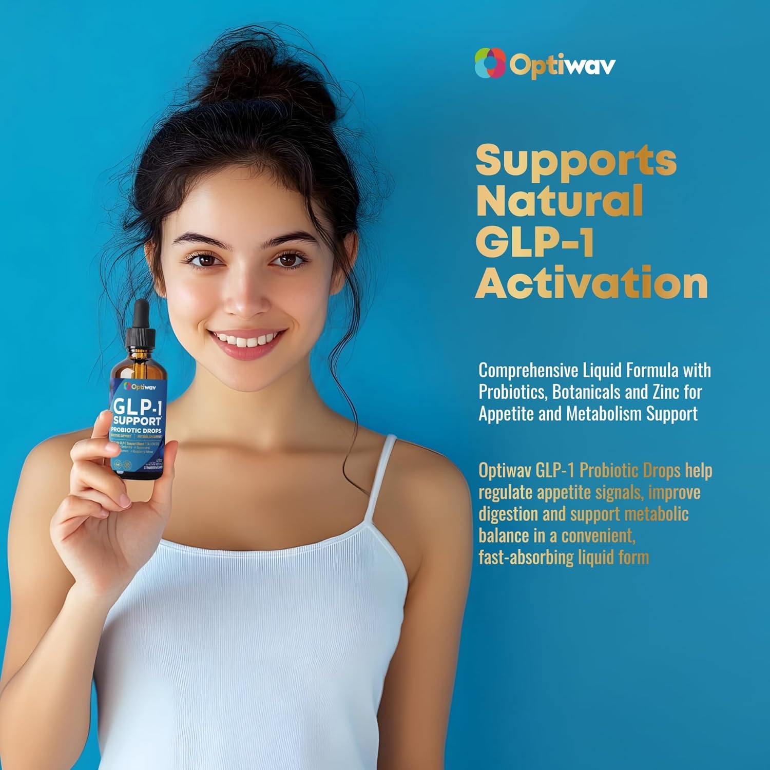 OptiWav GLP-1 Support Probiotic Supplement combines 12 key plant-based nutrients, probiotics, and zinc to help support and regulate appetite. Ingredients like Garcinia Cambogia and Raspberry Ketone help promote feelings of fullness and reduce cravings, supporting effective weight management by enhancing the pathway.