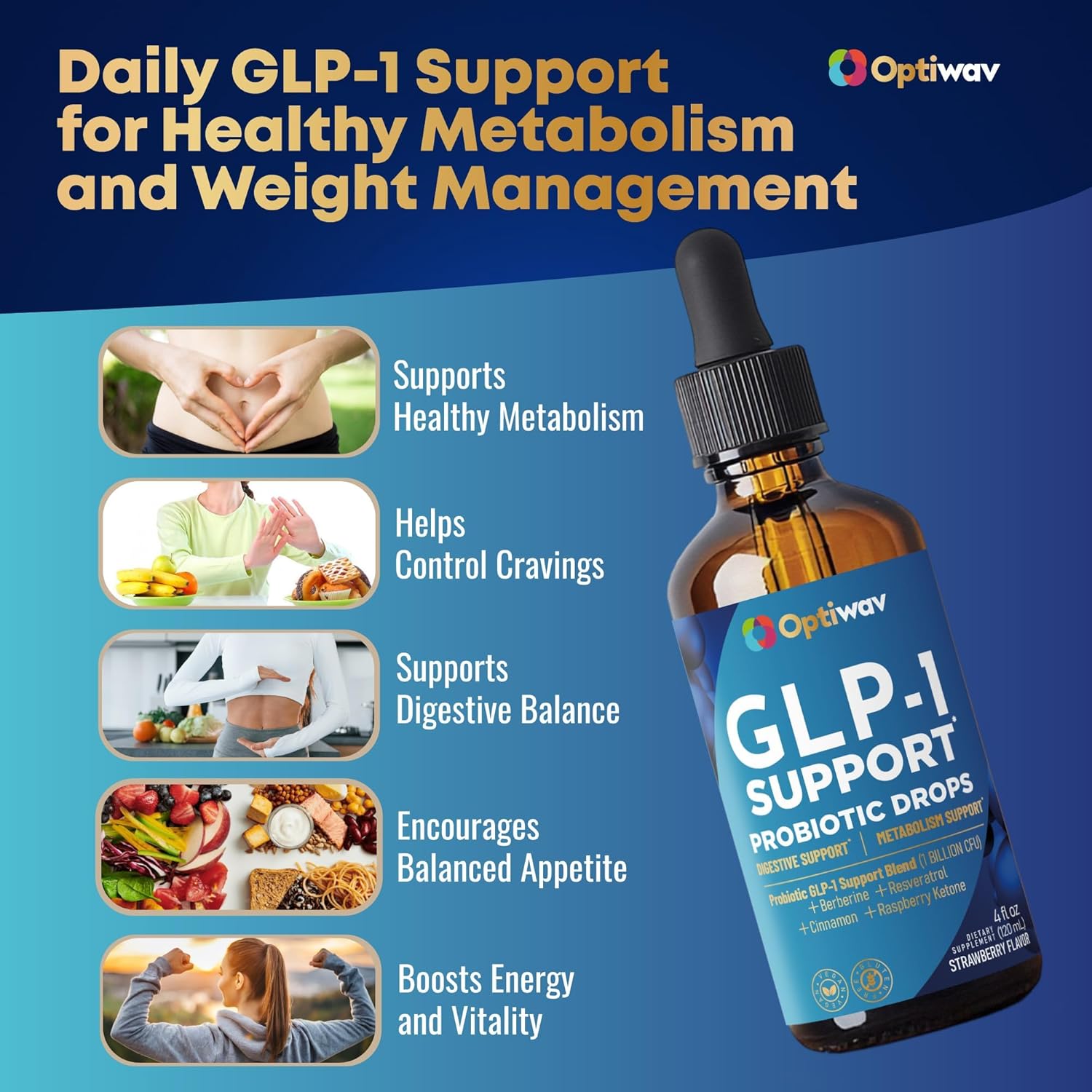 Promotes Healthy Metabolism and Energy Use: OptiWav GLP-1 Support Probiotic Supplement includes potent herbal ingredients such as Berberine, Cinnamon, and Resveratrol to support healthy metabolic activity and balanced energy regulation. These compounds work together to help maintain efficient nutrient processing while enhancing the pathway essential for appetite control and healthy body weight maintenance over time.