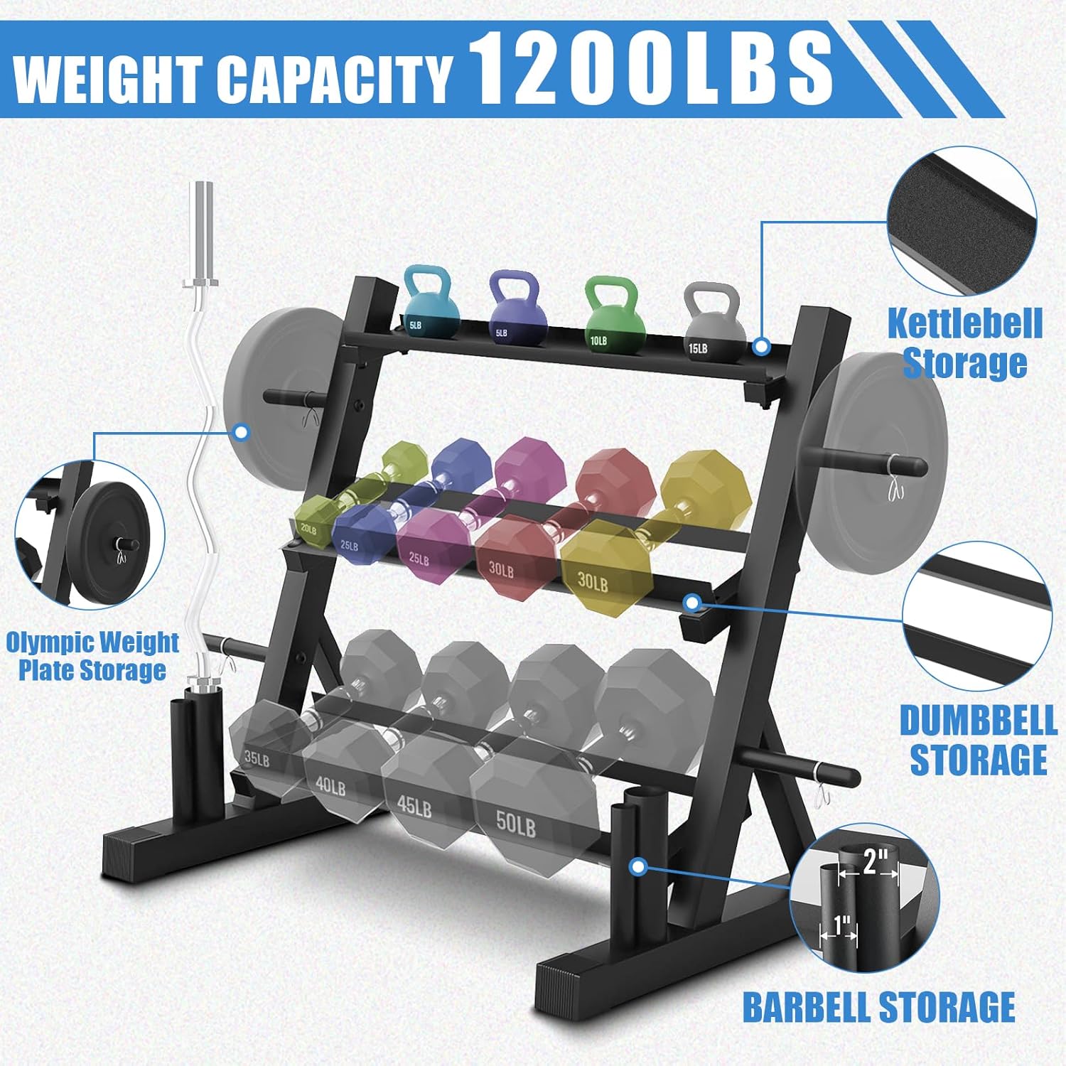ADJUSTABLE WIDTH FOR VERSATILE STORAGE:Each tier of this adjustable dumbbell rack is equipped with 2 screw holes and 1 bar width adjuster, allowing you to flexibly adjust the width from 2″ to 5″. This versatile weight stand fits all sizes of dumbbells, kettlebells, and weight plates, simplifying workout equipment organization and adapting to any home gym storage layout—no more wasted space on ill-fitting racks.