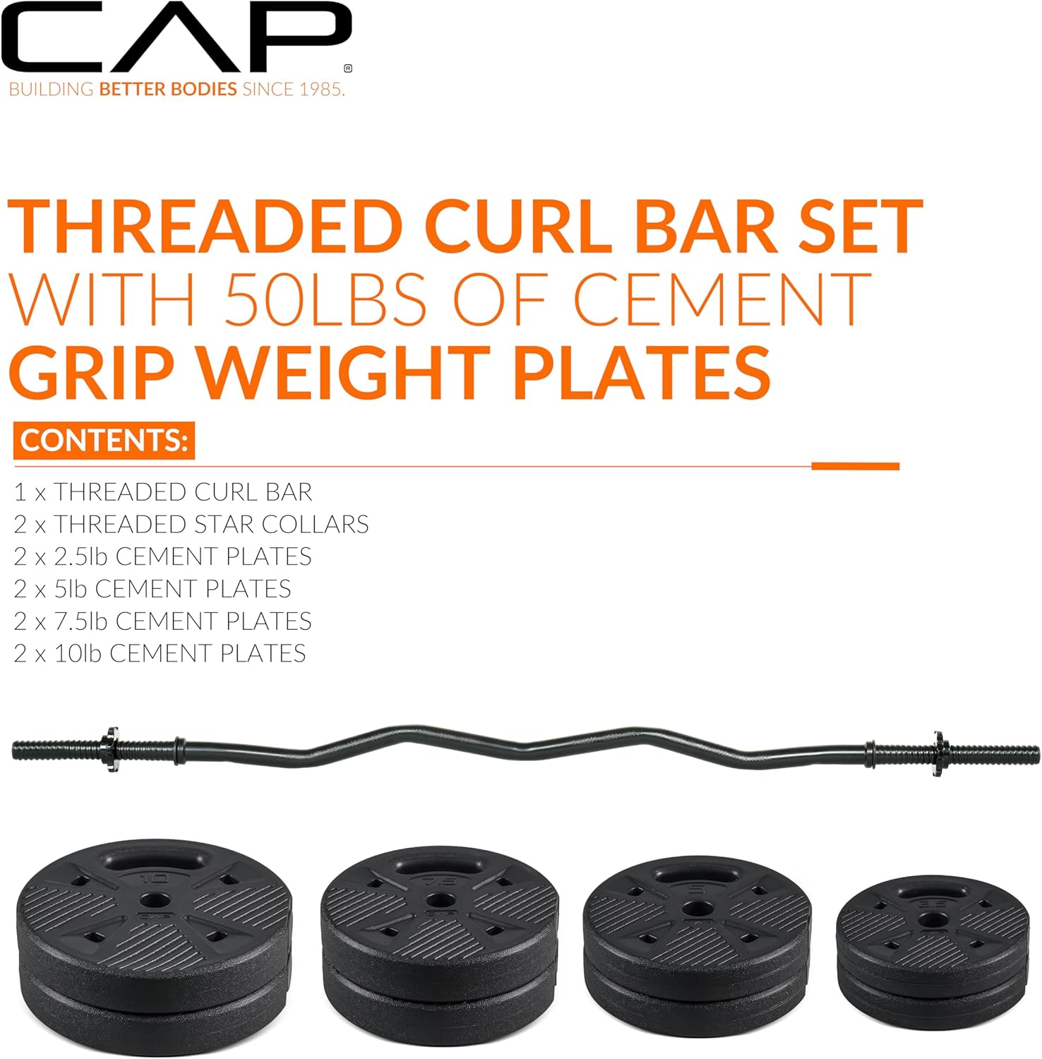 COMPLETE 50 LB CURL BAR SET – Includes a 47.2-inch threaded curl bar, 2 threaded star collars, and cement grip plates in 2.5 LB, 5 LB, 7.5 LB, and 10 LB pairs for customizable training.