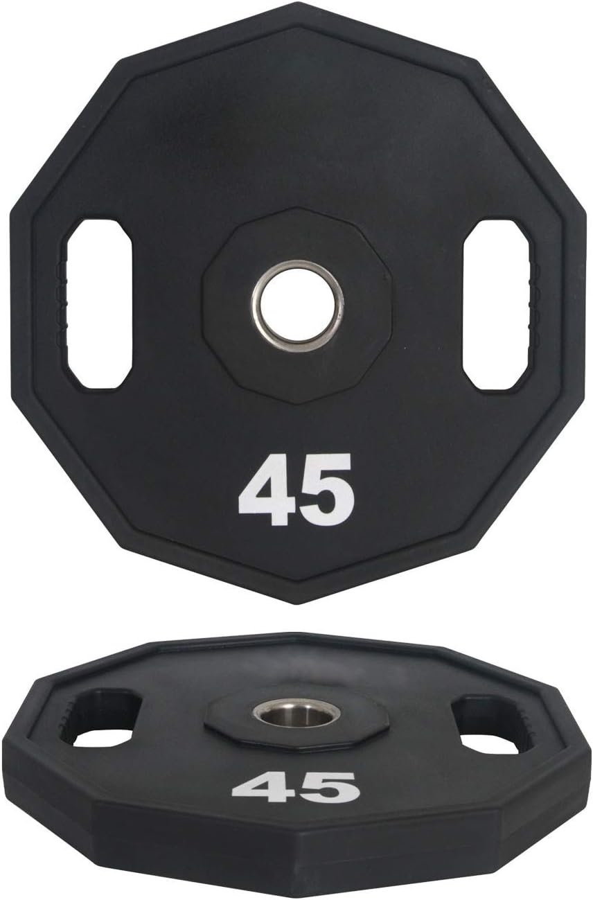 Machined center hole with urethane finish and 3-hole grip design allows for easy and safe handling. The plates accommodate 2-inch Olympic bars. Ideal for cardiovascular fitness and strength training. Sizes are 2. 5, 5, 10, 25, 35 and 45 lb. weights. Great for home or commercial use. Solid cast iron covered in noise reducing urethane . Multiple weight choices. Fits Olympic bars. Dual grips for easy handling. Plates sold individually.
