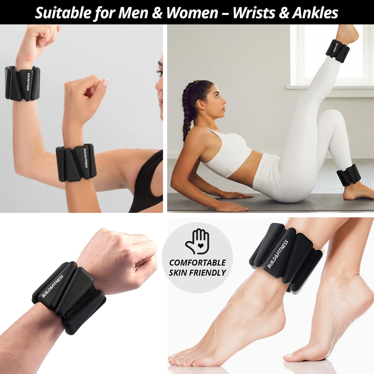 Black wrist and ankle weights with 'Build Fitness' branding. Woman wearing weights while exercising. Text: 'Wrist & Ankle Weights ADD RESISTANCE BUILD STRENGTH!'Black wrist and ankle weights with 'Build Fitness' branding. Woman wearing weights while exercising. Text: 'Wrist & Ankle Weights ADD RESISTANCE BUILD STRENGTH!'
