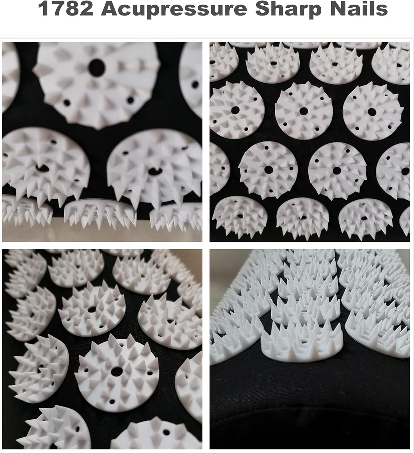 PREMIUM MATERIAL: The acupressure pillow has thousands of non-toxic plastic nails which sti-mulate acupressure points throughout the body without puncturing skin. The pillow has 1782 acupressure nails. Natural fabric and comfortable sponge.