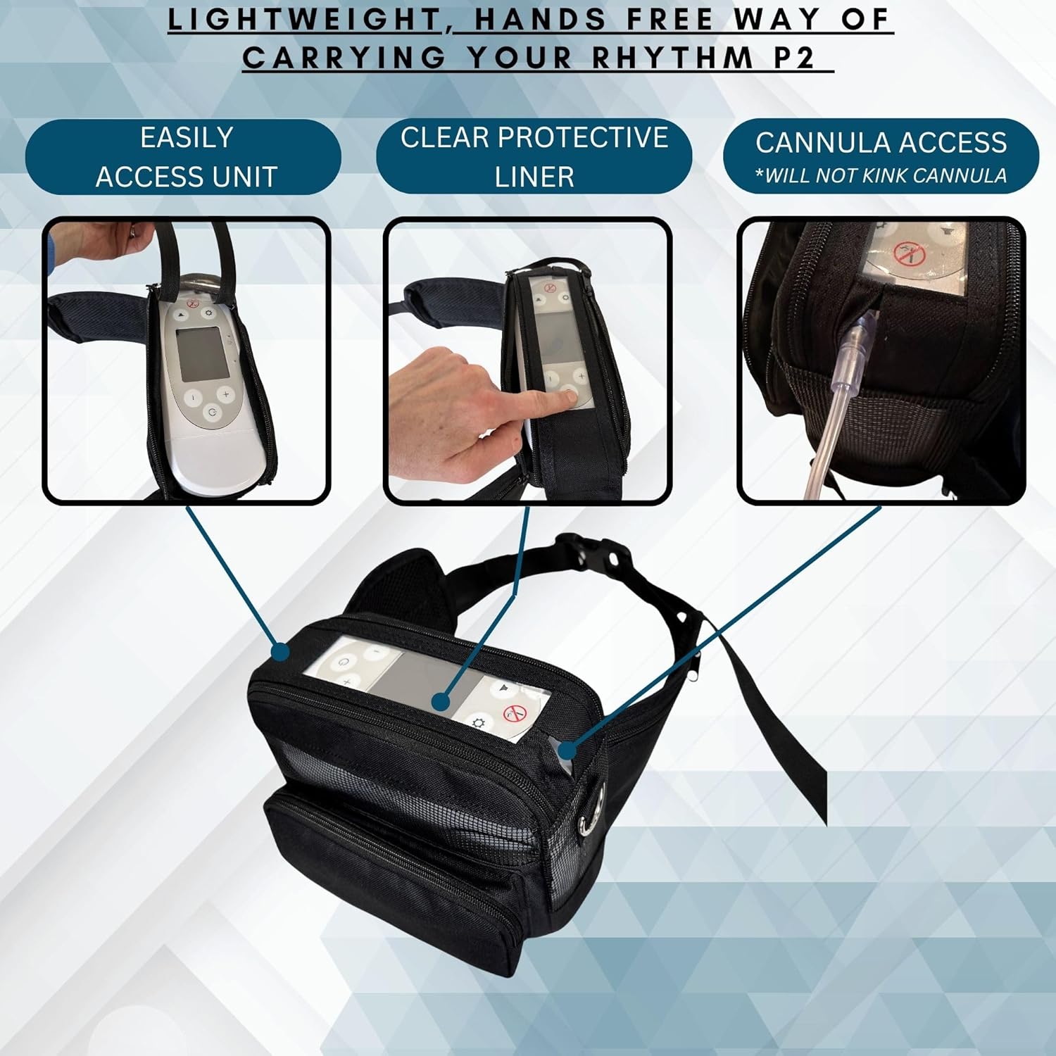 The Fanny/Hip Bag Fit For Rhythm P2 by O2totes provides a convenient and hands-free way to carry your Rhythm Healthcare POC. Its padded and zippered pockets are perfect for storing your money, credit cards, and other essentials while its larger front pocket is ideal for cords and cannulas. Stay prepared and mobile with this expertly designed fanny pack. Elevate your healthcare game with our Fanny Pack/Hip Bag Fit For Rhythm Healthcare P2. Designed to sit above your hips, preventing discomfort and allowing easy access to essentials. Don’t forget to tighten the loops for a snug fit. Experience improved comfort and convenience while wearing your P2 Cannula cutout on the side allows a kink free way to access your cannula as well as a back velcro tab that can be lifted to easily plug your unit in while not having to take out of the bag. Specifics: Fits Only: Rhythm Healthcare P2 & Rhythm Healthcare P2-E6(these are basically the same unit, the same size) Look at pictures below to make sure you have the correct unit or….call or email us for clarification of your unit. Fabric: Polyester blend, hex mesh panels; extremely durable & breathable fabrics we have tested over the years that are proven to work best with POC’s