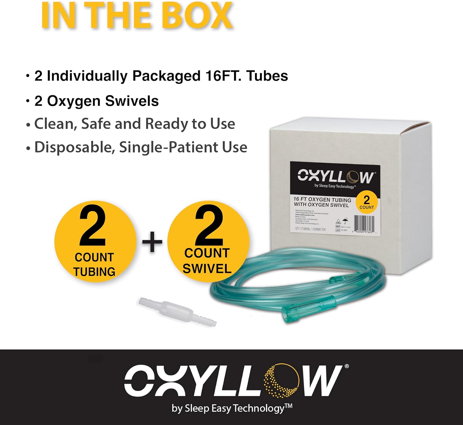 2 COUNT 16 ft tubing + 2 Swivel Connectors—Individually sealed oxygen pack, oxygen tubing is clean, safe and ready to use. Single-patient use. Disposable tubing is recommended to be replaced every 60-days or as needed from heavy wear. May be useful for additional extend reach with Home Oxygen Concentrator as a nasal cannula accessory.