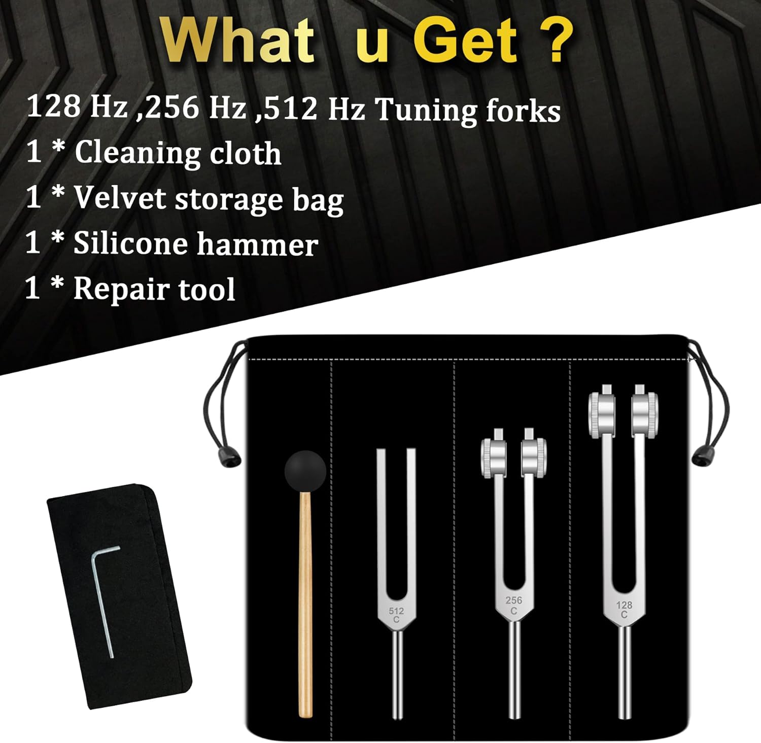 ✅【What You Get ?】: Tuning forks set Includes 3 pcs tuning fork (128Hz, 256Hz and 512Hz ), rubber mallet, cleaning cloth and repair tool, that packed in a beautiful velvet storage bag.