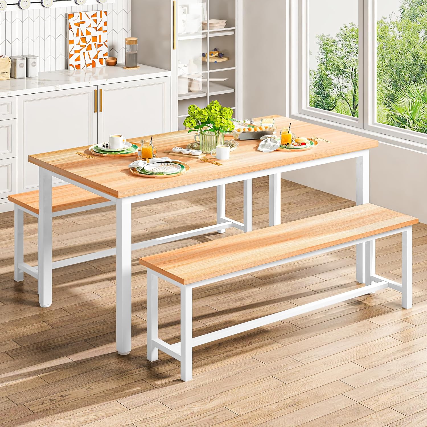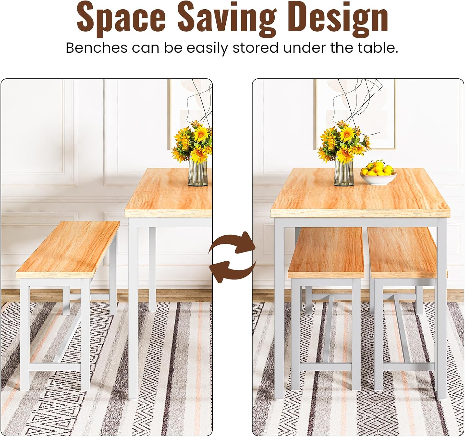 【Space-saving Dinner Table Set with Benches】This innovative 3-piece set is designed for modern living, featuring two benches that slide completely under the table. Free up precious floor space and create a more open, organized room—ideal for apartments, small homes, and cozy breakfast nooks.