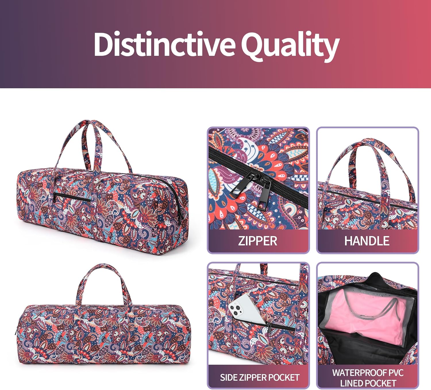 Distinctive quality: The yoga mat bag is designed with vintage bohemian patterns. Features high-quality cotton canvas and reinforced sewing threads.