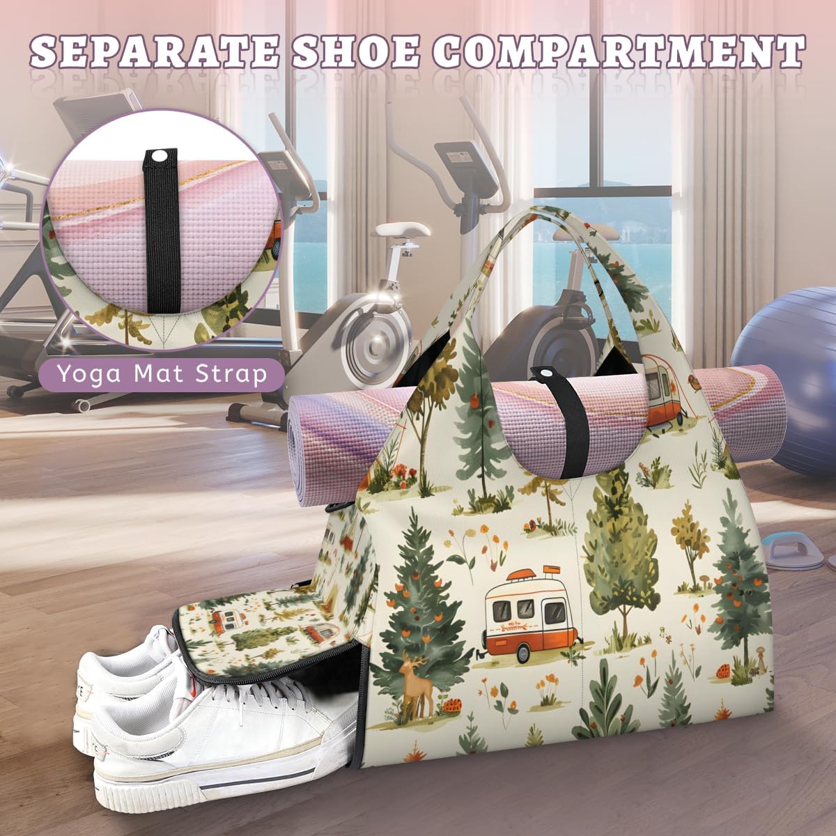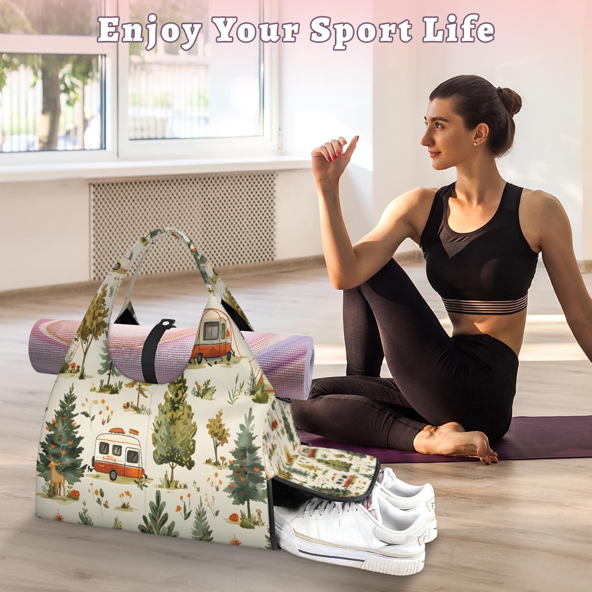 Happy Camper Yoga Mat Bag for Dance Workout with Yoga Strap & Shoes Compartment Farmhouse Camping Gym Duffle Bag for Women