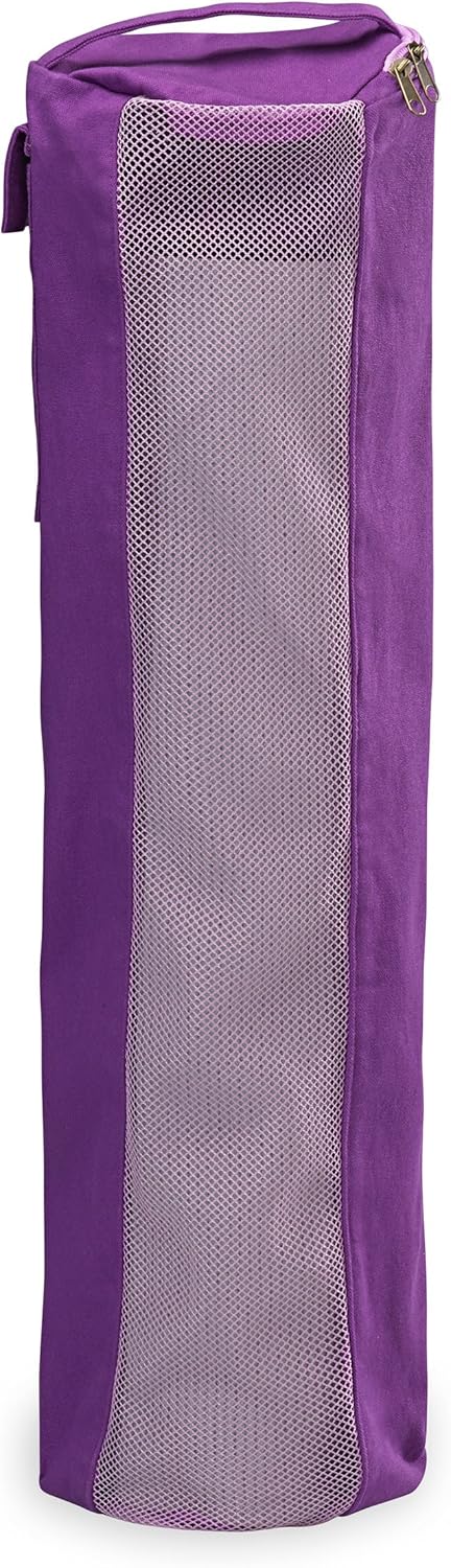 SPECIFICATIONS: (1) Breathable Yoga Mat Bag By Gaiam, Model 05-62155, Purple, New In Retail Packaging. 30″L x 6″W; Fits mats up to 26″W x 72″L. 100% Cotton fabric, 100% Polyester mesh. Machine wash separately, Dry flat.